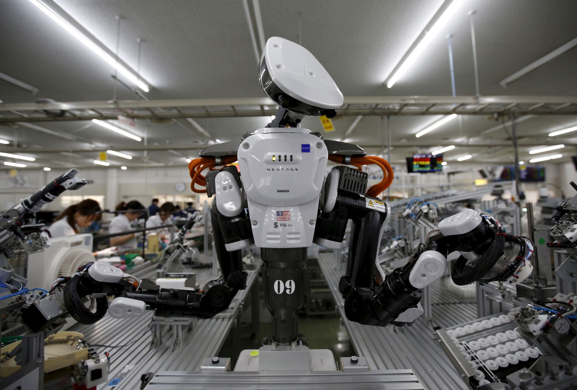 A humanoid robot works side by side with employees in the assembly line ...